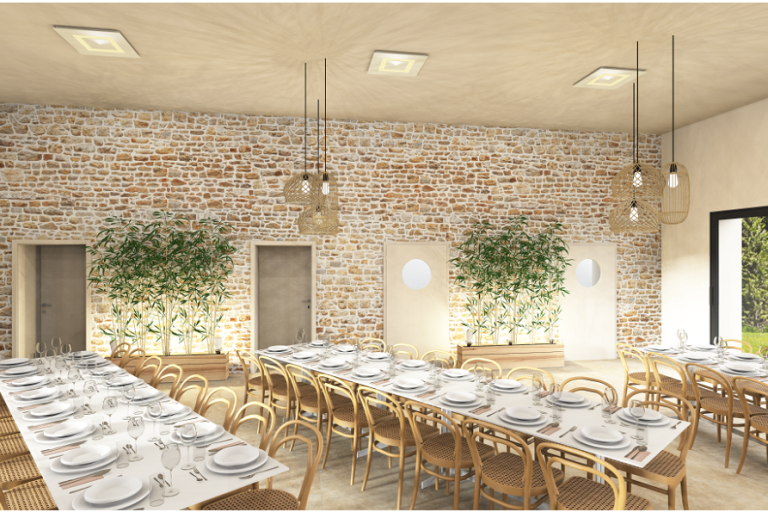 Une salle lumineuse, de 170 m², qui allie le charme de l’ancien à une atmosphère chaleureuse et conviviale. Elle séduit par ses pierres apparentes, ses volumes généreux et sa lumière douce, offrant un décor authentique et raffiné pour célébrer chaque moment important.